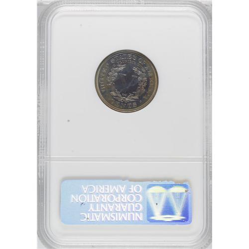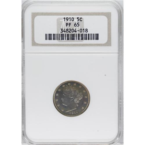 <B>1910 5C PR65 NGC.</B></I> Rings of deep mustard-gold patina surrounds the silver-gray centers on this late-date Gem. Two carbon spots appear on the surfaces, one below Liberty's ear and the other on the right side of the V within the wreath.<BR><BR><b>Shipping:</b> Coins & Currency (<a target="_blank" href="http://www.heritageauctions.com/common/shipping.php">view shipping information</a>)
