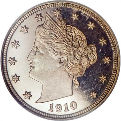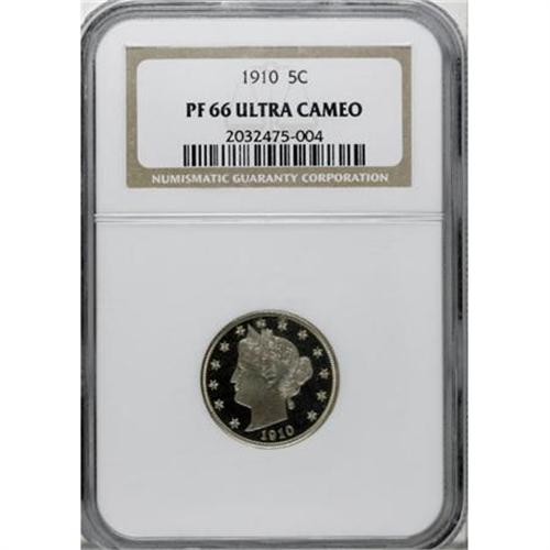 <B>1910 5C PR66 Ultra Cameo NGC.</B></I> A magnificent example of what a proof should look like. The coin has sandblast features virtually floating on a sea of glassy fields. Fully struck and delicately toned in faint apricot tints. Desirable in such exceptional quality. Census: 3 in 66 Ultra Cameo, 0 finer (11/07).<BR><BR><b>Shipping:</b> Coins & Currency (<a target="_blank" href="http://www.heritageauctions.com/common/shipping.php">view shipping information</a>)