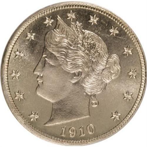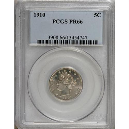 <B>1910 5C PR66 PCGS.</B></I> PCGS Population (81/31). NGC Census: (123/52). Mintage: 2,405. Numismedia Wsl. Price for NGC/PCGS coin in PR66: $720. (#3908)<BR><BR><B>Coin Engraver:</B> Charles E. Barber<BR><BR><b>Shipping:</b> Coins & Currency (<a target="_blank" href="http://www.heritageauctions.com/common/shipping.php">view shipping information</a>)