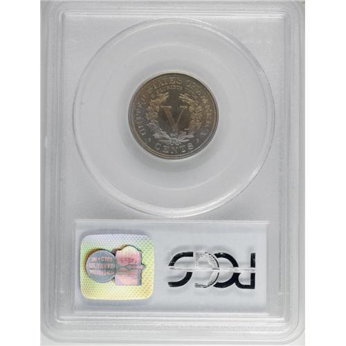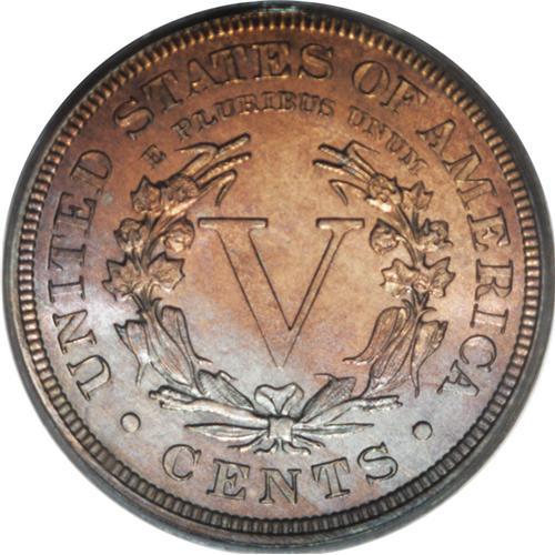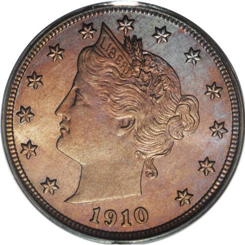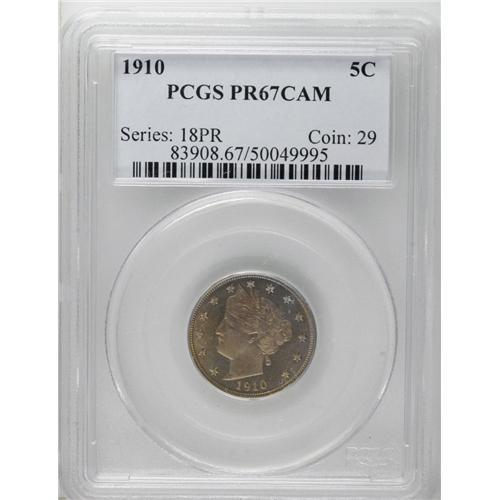 <B>1910 5C PR67 Cameo PCGS.</B></I> A layer of copper-gold patination dominates both sides, save for waves of sky-blue that invade the upper obverse and the lower reverse. The frosty, sharply delineated design features appear to be suspended over the bright reflective fields, and both faces are impeccably preserved.<BR><I>From The Paul Vine Collection.</B></I><BR><BR><b>Shipping:</b> Coin/Currency (<a target="_blank" href="http://www.heritageauctions.com/common/shipping.php">view shipping information</a>)