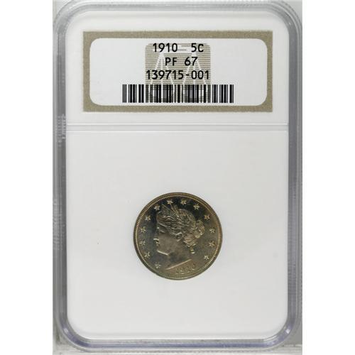 <B>1910<5C> PR67 NGC.</B></I> This is a gorgeous Superb Gem with rich gold toning over medium gray proof surfaces. The fields are moderately reflective with satiny luster rather than the deep mirrored finish that is usually seen.