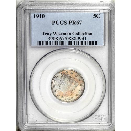 <B>1910<5C> PR67 PCGS.</B></I> A sharply struck and moderately reflective Superb Gem that sports vivid orange-gold, blue, and lavender patina. Highly appealing. Population: 30 in 67, 2 finer (8/06).<BR><I>From The Troy Wiseman Collection.</B></I>