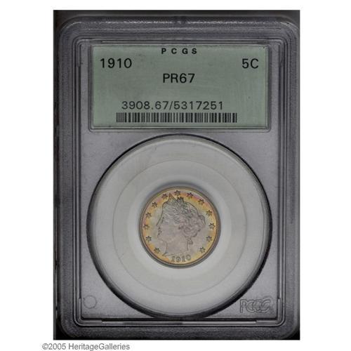 1910 5C PR67 PCGS. Exquisitely struck, with light gray 1910[5C] PR67 PCGS.