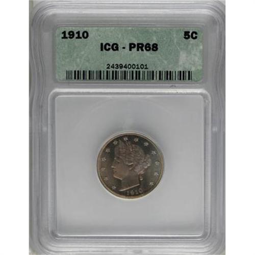 <B>1910 5C PR68 ICG.</B></I> Vivacious pastel-rose and lilac toning generously coats both sides of this Superb Gem specimen, while failing to impede the radiant luster. The razor sharp strike includes full definition on that pesky, often-weak left (facing) ear of corn, as well as throughout the wreath details, and on the star centrils and Liberty's hair. Even under a loupe, there are no visible distractions of any kind.<BR><BR><B>Coin Engraver:</B> Charles E. Barber<BR><BR><b>Shipping:</b> Coins & Currency (<a target="_blank" href="http://www.heritageauctions.com/common/shipping.php">view shipping information</a>\)