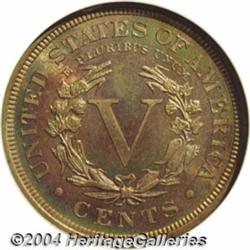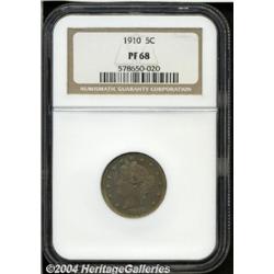 <B>1910<5C> PR68 NGC.</B></I> One would be hard pressed to find a more pristine and beautiful proof Liberty Nickel of any date. This scintillating 1910 is devoid of any mentionable distractions, and a colorful overlay of rainbow-like iridescence covers each side as the coin is turned under a light. Indeed, the fully brought up features are knocking on the door of numismatic perfection. Modest, yet appreciable brightness is noticed in the fields just beneath the toning. Combined NGC and PCGS Population: 9 in 68, there are, perhaps not surprisingly, none finer (7/04). <BR><BR><B>Important notice:</B> Heritage usually auctions material at the rate of 200-250 lots per hour. On some occasions eBay Live bid software or the Internet may not be able to keep up with the pace of the auction. We recommend placing a realistic absentee bid now as insurance to avoid disappointment. Occasionally the auctioneer may eliminate or reject an eBay Live bid, and the auctioneer may also reopen a lot after the close of the eBay live bidding (usually because we missed an audience bid), and may reject your bid even if it shows you as the winning bidder. By bidding via eBay Live, you agree that Heritage may award the lot to another bidder at its sole discretion under the circumstances described above or any other reasonable circumstances. Since eBay bids are not shown to us until we open the lot on the floor, we treat those bids just like floor bids. In most cases the floor responds before the eBay bid is presented to us, due to Internet lag time, so for consistency we have made it a policy that floor bids are always considered first over tie eBay live bids. Also please note that all Heritage lots purchased through eBay Live carry a 20% Buyer's Premium. Please make sure you read the Terms and Conditions before you bid. </span></font></tr></table></td></tr></table>