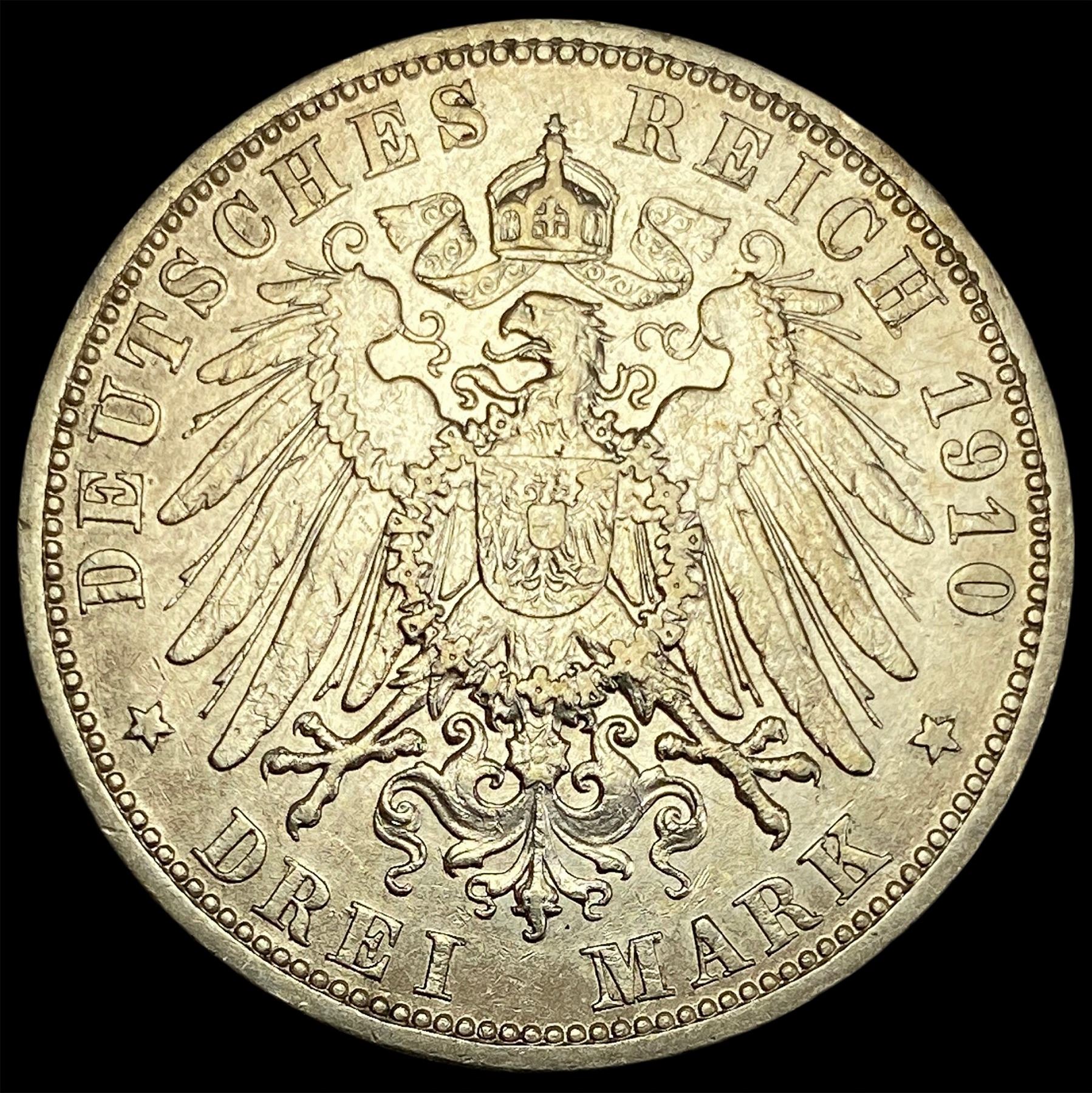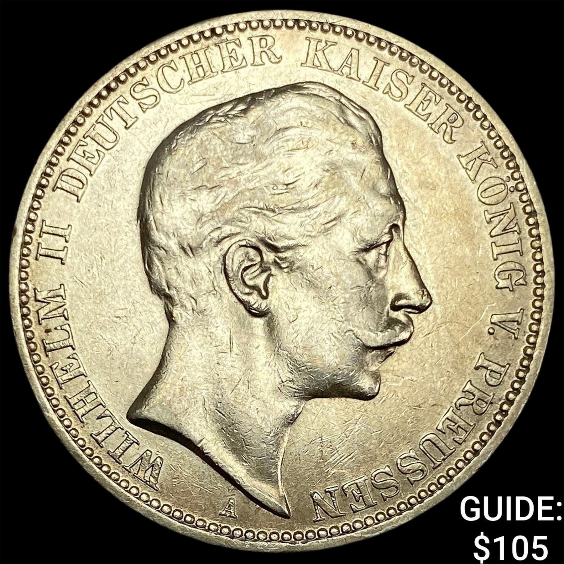 1910-A Prussia Silver 3 Reichsmark CLOSELY UNCIRCULATED