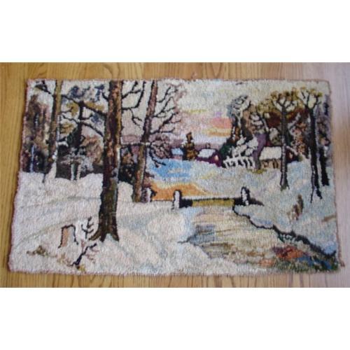 This hooked rag rug looks almost as good from the back as from the front. The scene is so well detailed, it looks like an impressionist painting. There are cabins in the woods with a stream and bridge in the foreground in the mist of taller trees. Early 20th Century, American, mostly probably East Coast. The rug measures 2'10" by 1'9". Some wear to the edges of the rug that need repair and a bit of fading but other than a good cleaning needed, this rug is in excellent antique condition.