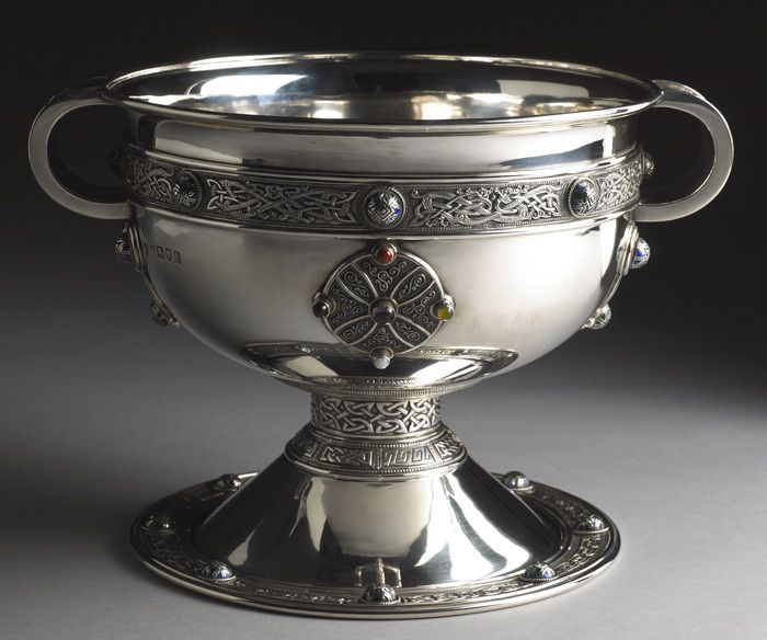 An extremely fine and stunning piece of silverwork by Mappin & Webb of London in the form of a replica Ardagh Chalice. With silver celtic knotwork design and coloured with enamel and glass. Hallmarked London 1910 and with maker's mark of Mappin & Webb.