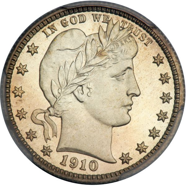 1910 Barber Quarter Dollar. PCGS graded Proof 68 Cameo. Only 551 minted. A wonderful white gem cameo. An very bright and lustrous gem that you can use as a benchmark for the few other Barber Quarters that share this towering grade. While the strike is forthright and crisp, it is so crisp and detailed as to cause the viewer to take a second look, and a third. Without a doubt few others can compare. this coin is simply dazzling. The fields go black when angled in the light and the frosted devices present a profound cameo effect. We are powerless to discover any imperfection, mint-made or otherwise, on this flawless coin. Truly an item for the ultimate type set. Pop 3; none finer at PCGS (PCGS # 85696) .