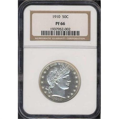 <b>1910 Barber Half Dollar. NGC graded Proof 66.</b> An exceptionally fresh looking gem in all respects, the mirror luster is swirling and unyielding, white frosted highlights, though not strong enough for an "ultra cameo" designation, nevertheless blossom on both sides. The strike is bold, as expected, indeed, as bold as ever seen on virtually any Proof date in the Barber series. Only 551 Proofs were minted this year, an unusually low number <b>(PCGS # 6557)</b> <i>