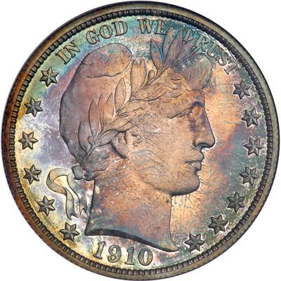 1910 Barber Half Dollar. NGC graded Proof 68. Lovely rainbow toning. Only 551 Proofs issued. A thrilling example of this always-popular Barber Type. This exception Proof specimen is well toned and very nicely struck, including clockwork precision seen in the eagle. This superb toned Proof has the appearance of a coin from an original Proof set stored in the mint tissue wrappers for the better part of a hundred years. In the early 1990s, a group of several dozen such original Proof sets, now NGC or PCGS certified and sold individually, hit the market. They made quite a splash and were quickly absorbed by eager buyers.