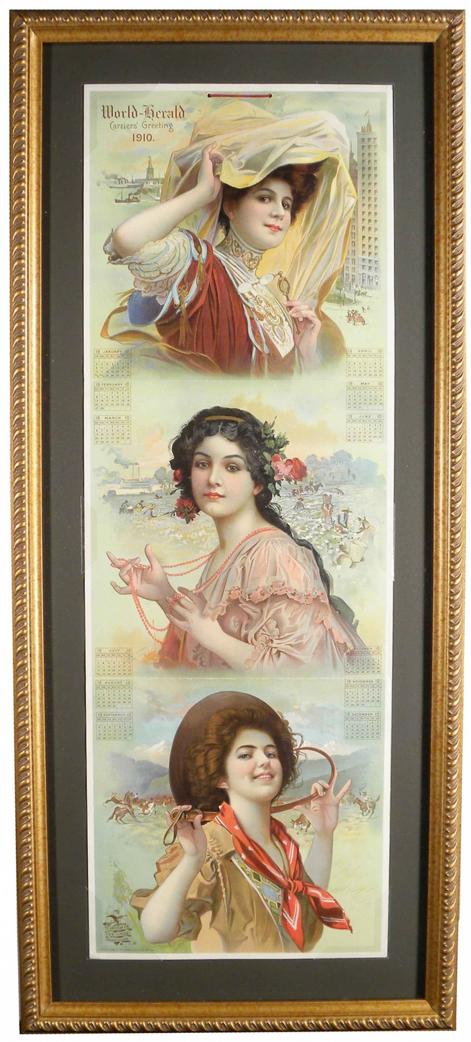 1910 Calendar for World-Herald depicting The American Girl. "To see her is to admire her, to know her is to love her". Framed under glass. Two vertical fold otherwise near mint condition. 11 1/2 X33 inches image only.