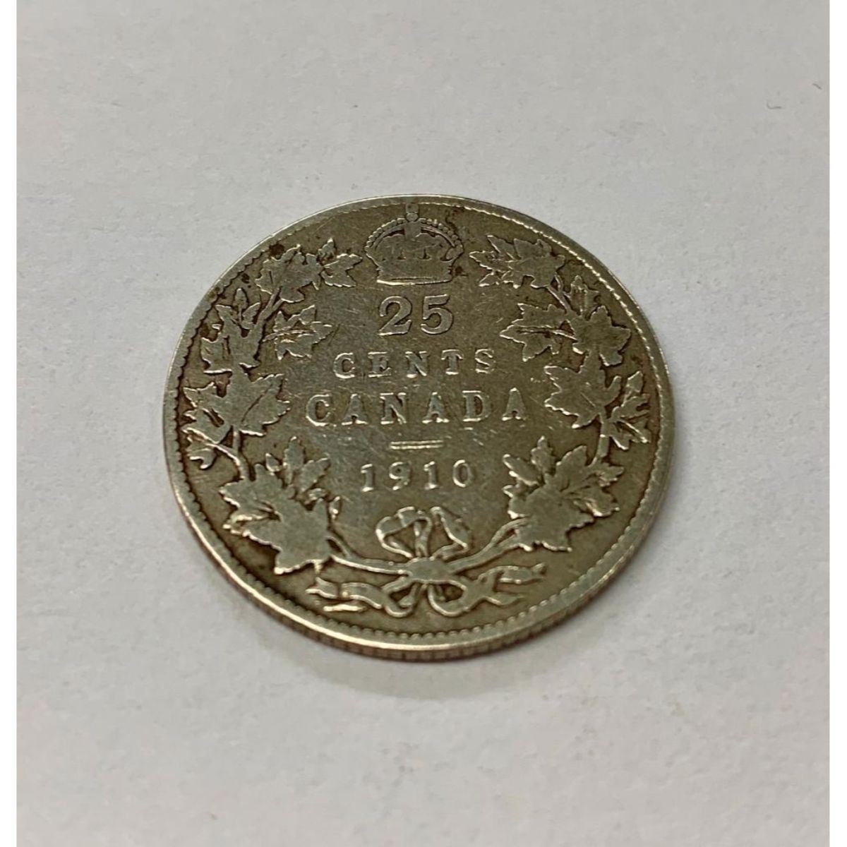 Obverse The portrait in left profile of George V is surrounded with the inscription "GEORGIVS V DEI GRA: REX ET IND:IMP" (George V, King and Emperor of India by the grace of God) Lettering:Â GEORGIVS V DEI GRA: REX ET IND:IMP: Reverse The facial value, accompanied with the inscription "CANADA", is surrounded with two maple boughs and a crown Lettering:Â 25 CENTS CANADA 1914 Alloy: 92.5% silver, 7.5% copper
