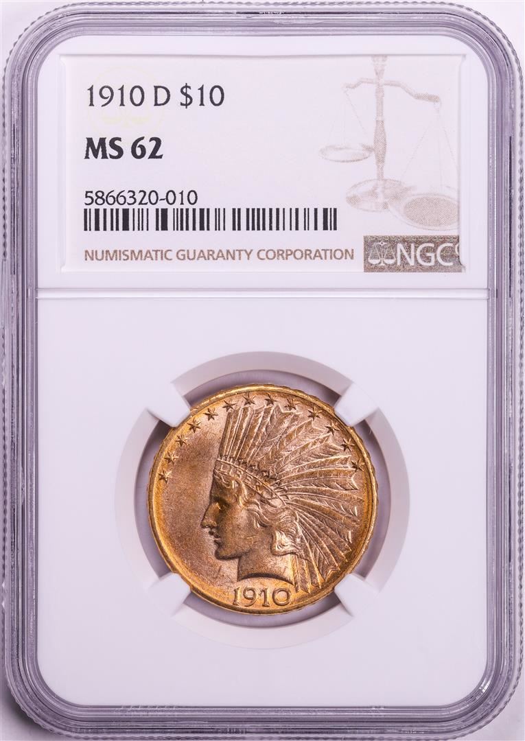 One 1910-D $10 Indian Head Eagle Gold Coin NGC MS62 Great Color!. NGC Certified.