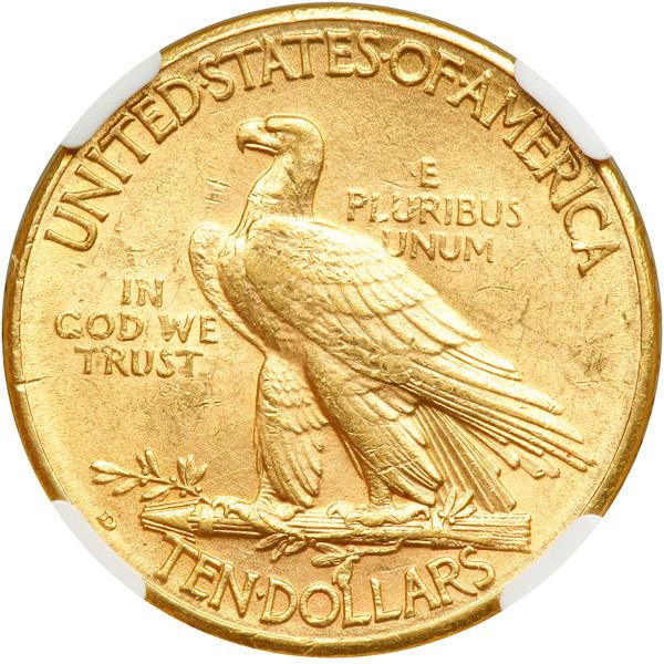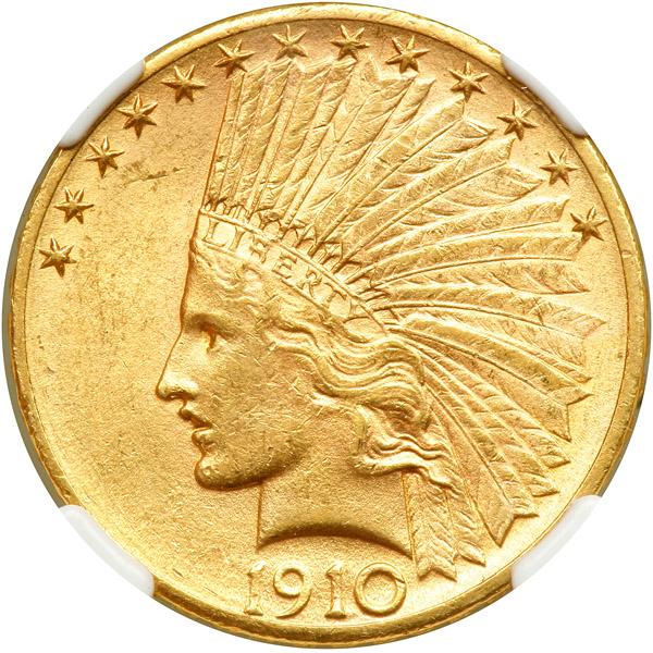 1910-D $10 Indian. NGC graded MS-61. A hint of light golden tone (PCGS # 8866) .