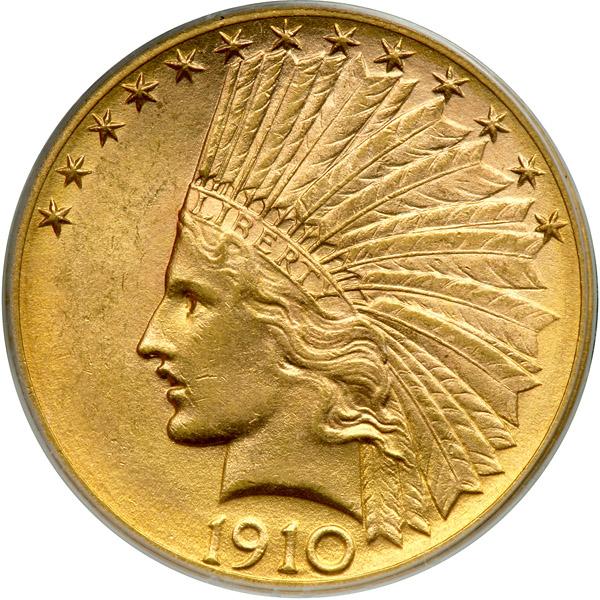 1910-D $10 Indian. PCGS graded MS-62. Light pinkish color toning (PCGS # 8866) .