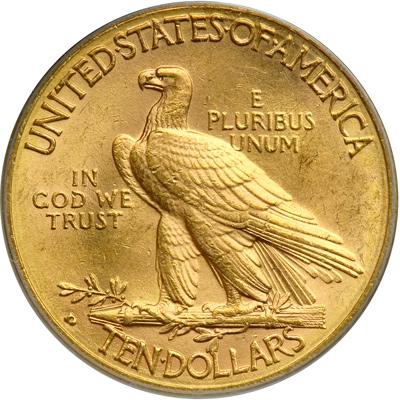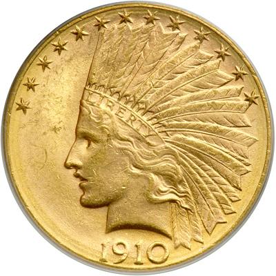 1910-D $10 Indian. PCGS graded MS-62. A frosty mint example that has a few tiny bagmarks on the face, none, however, worth special mention. Satiny surfaces (PCGS # 8866) .
