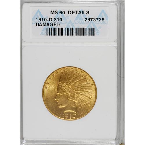 <B>1910-D $10 --Damaged--ANACS. MS60 Details.</B></I> NGC Census: (346/12068). PCGS Population (110/4637). Mintage: 2,356,640. Numismedia Wsl. Price for NGC/PCGS coin in MS60: $515. (#8866)<BR><BR><b>Shipping:</b> Coins & Currency (<a target="_blank" href="http://www.heritageauctions.com/common/shipping.php">view shipping information</a>)