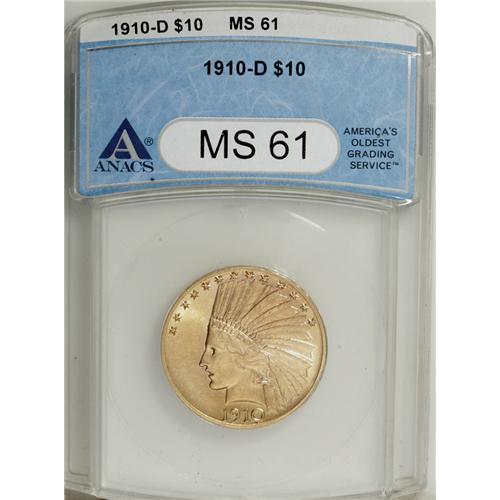 <B>1910-D $10 MS61 ANACS.</B></I> NGC Census: (1512/4425). PCGS Population (555/4079). Mintage: 2,356,640. Numismedia Wsl. Price: $620. (#8866)<BR><BR><b>Shipping:</b> Coins & Currency (<a target="_blank" href="http://www.heritageauctions.com/common/shipping.php">view shipping information</a>)