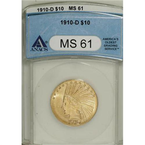 <B>1910-D $10 MS61 ANACS.</B></I> NGC Census: (1572/4648). PCGS Population (556/4197). Mintage: 2,356,640. Numismedia Wsl. Price for NGC/PCGS coin in MS61: $685. (#8866)<BR><BR><B>Coin Engraver:</B> Augustus Saint-Gaudens<BR><BR><b>Shipping:</b> Coins & Currency (<a target="_blank" href="http://www.heritageauctions.com/common/shipping.php">view shipping information</a>)