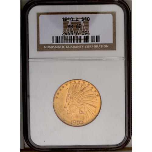 <B>1910-D<$10> MS62 NGC.</B></I> A copper-gold example with a few tinges of brown on the obverse. Abundantly lustrous and appealing, despite the grade-consistent abrasions noted.