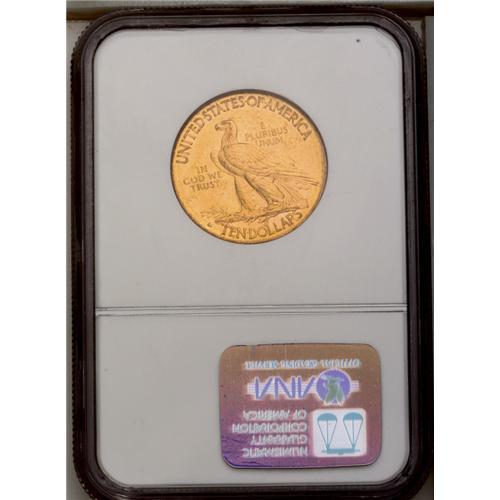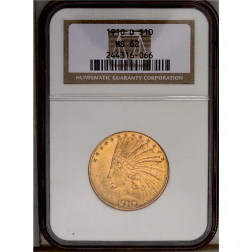<B>1910-D<$10> MS62 NGC.</B></I> Lightly abraded surfaces as expected at the MS62 grade level. Both sides have frosty yellow-gold luster with deep brown toning.