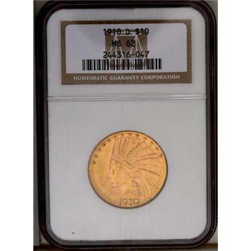 <B>1910-D<$10> MS62 NGC.</B></I> Lustrous yellow-gold surfaces with subtle pink toning. Both sides of this frosty Mint State example are lightly abraded. Splashes of olive-brown color accent the devices.