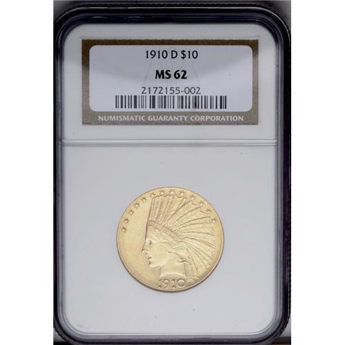 <B>1910-D<$10> MS62 NGC.</B></I> The matte-like surfaces are remarkably clean for the grade. Well struck with effulgent luster and enticing peach-gold toning. A pleasing Mint State example of this common Indian eagle.