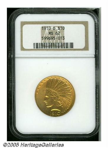 <B>1910-D<$10> MS62 NGC.</B></I> Well struck with rich orange-red toning, full luster, matte-like surface textures, and a handful of trivial contact marks on obverse and reverse alike, limiting the coin's grade.
