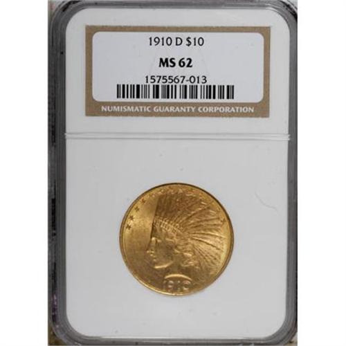 <B>1910-D $10 MS62 NGC.</B></I> NGC Census: (2497/2084). PCGS Population (2150/1990). Mintage: 2,356,640. Numismedia Wsl. Price for NGC/PCGS coin in MS62: $975. (#8866)<BR><BR><B>Coin Engraver:</B> Augustus Saint-Gaudens<BR><BR><b>Shipping:</b> Coins & Currency (<a target="_blank" href="http://www.heritageauctions.com/common/shipping.php">view shipping information</a>\)