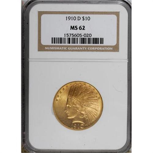 <B>1910-D $10 MS62 NGC.</B></I> NGC Census: (2502/2093). PCGS Population (2155/1990). Mintage: 2,356,640. Numismedia Wsl. Price for NGC/PCGS coin in MS62: $975. (#8866)<BR><BR><B>Coin Engraver:</B> Augustus Saint-Gaudens<BR><BR><b>Shipping:</b> Coins & Currency (<a target="_blank" href="http://www.heritageauctions.com/common/shipping.php">view shipping information</a>\)