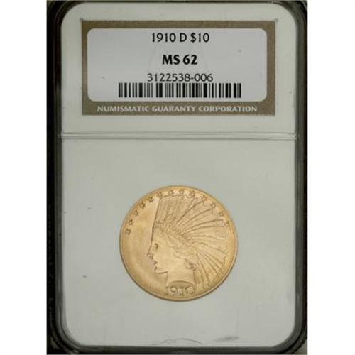 <B>1910-D $10 MS62 NGC.</B></I> NGC Census: (2588/2153). PCGS Population (2197/2050). Mintage: 2,356,640. Numismedia Wsl. Price for NGC/PCGS coin in MS62: $975. (#8866)<BR><BR><B>Coin Engraver:</B> Augustus Saint-Gaudens<BR><BR><b>Shipping:</b> Coins & Currency (<a target="_blank" href="http://www.heritageauctions.com/common/shipping.php">view shipping information</a>)