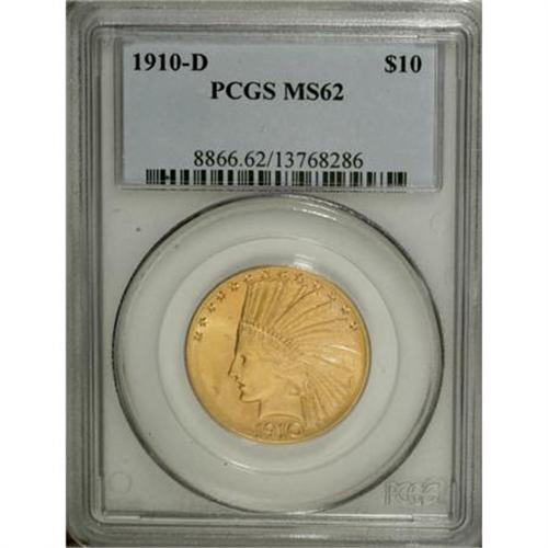 <B>1910-D $10 MS62 PCGS.</B></I> PCGS Population (2254/2110). NGC Census: (2665/2213). Mintage: 2,356,640. Numismedia Wsl. Price for NGC/PCGS coin in MS62: $885. (#8866)<BR><BR><B>Coin Engraver:</B> Augustus Saint-Gaudens<BR><BR><b>Shipping:</b> Coins & Currency (<a target="_blank" href="http://www.heritageauctions.com/common/shipping.php">view shipping information</a>)