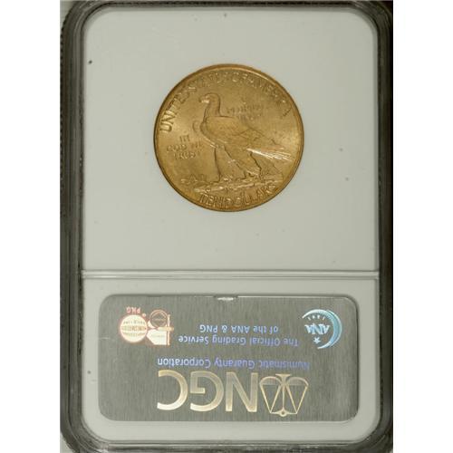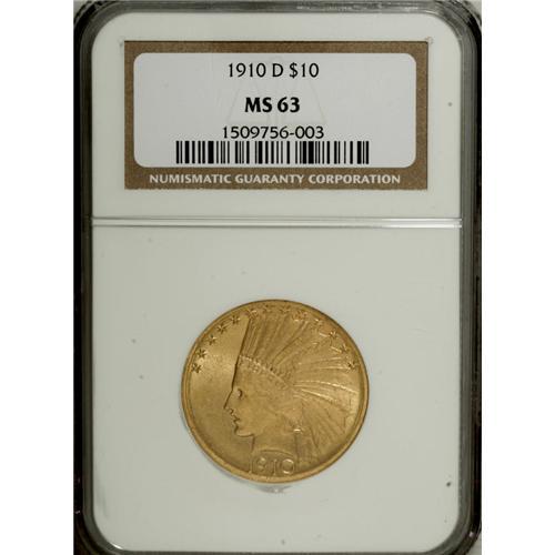 <B>1910-D $10 MS63 NGC.</B></I> Matte-like surfaces display vibrant luster and pleasing, light peach-gold toning. The design motifs are well struck and there are few marks on either side.<BR><BR><b>Shipping:</b> Coins & Currency (<a target="_blank" href="http://www.heritageauctions.com/common/shipping.php">view shipping information</a>)