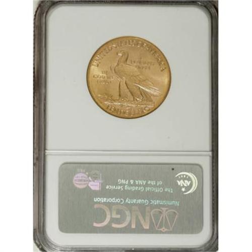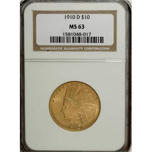 <B>1910-D $10 MS63 NGC.</B></I> A radiant Select representative of this populous Denver eagle issue, well-defined overall with lightly abraded yellow-gold fields. Subtle canary accents visit the devices.<BR><BR><B>Coin Engraver:</B> Augustus Saint-Gaudens<BR><BR><b>Shipping:</b> Coins & Currency (<a target="_blank" href="http://www.heritageauctions.com/common/shipping.php">view shipping information</a>)