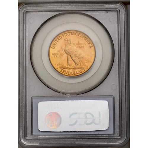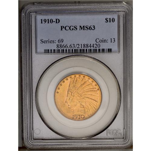 <B>1910-D<$10> MS63 PCGS.</B></I> Softly frosted luster highlights matte-like surfaces that display pleasing yellow-gold, lilac, and steel-blue coloration. A typical number of small abrasions exist on the reverse, for the assigned grade level.