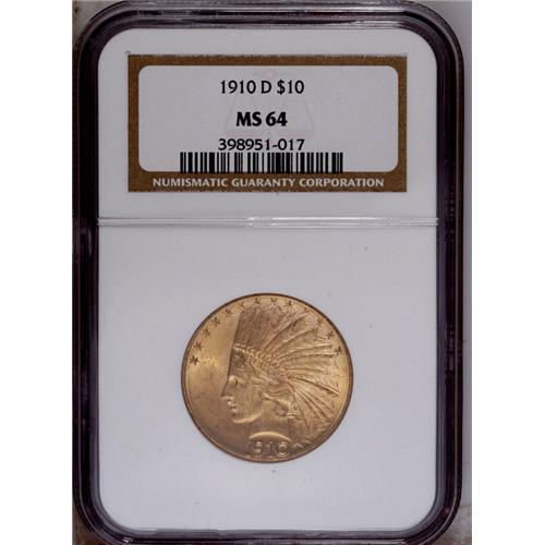 <B>1910-D $10 MS64 NGC.</B></I> An attractive grainy-textured Ten with near-Gem surfaces that are sure to please even the most discerning collector. Infrequently seen in finer grades.