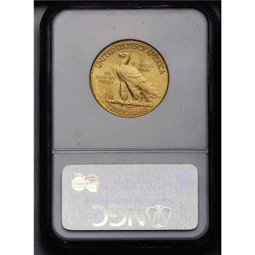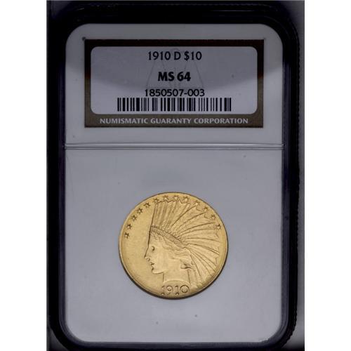 <B>1910-D<$10> MS64 NGC.</B></I> Booming luster sweeps impeccably smooth surfaces. An exemplary near-Gem despite trivial striking softness on the base of the olive branch. Demand for quality Indian eagles is both formidable and ceaseless.