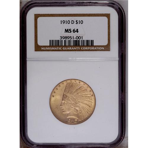 1910-D $10 MS64 NGC. Bordering Gem quality, this D-min