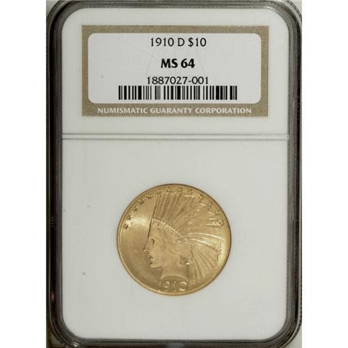 <B>1910-D $10 MS64 NGC.</B></I> Highly lustrous light yellow-gold surfaces exhibit well struck design elements. This is an important opportunity due to the relatively low number of higher quality Gem examples that have been certified.<BR><BR><b>Shipping:</b> Coin/Currency (<a target="_blank" href="http://www.heritageauctions.com/common/shipping.php">view shipping information</a>)