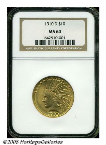 <B>1910-D<$10> MS64 NGC.</B></I> Well struck with softly frosted fine grain surfaces that display lovely pastel colors and are near-pristine, on the obverse. An extremely faint luster graze, in the far left reverse field, between IN GOD WE TRUST and the rim, and a couple of tiny contact marks, in the field area above E PLURIBUS UNUM, are the only conceivable obstacles to a Gem grade assessment.