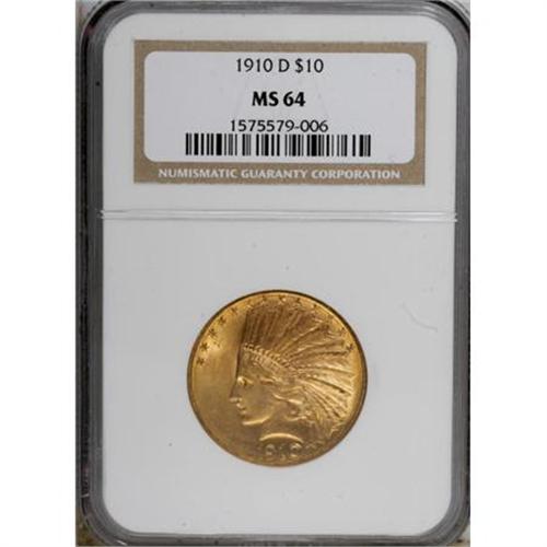 <B>1910-D $10 MS64 NGC.</B></I> The lemon-yellow and apricot-gold surfaces of this eagle have soft, pleasing luster and few marks. The hair at Liberty's ear shows slight weakness, but the eagle is boldly impressed. The most available Denver Mint issue of the type, but nonetheless scarce as a near-Gem.<BR><BR><B>Coin Engraver:</B> Augustus Saint-Gaudens<BR><BR><b>Shipping:</b> Coins & Currency (<a target="_blank" href="http://www.heritageauctions.com/common/shipping.php">view shipping information</a>\)