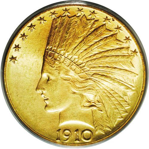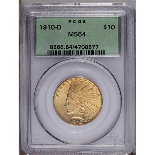 <B>1910-D<$10> MS64 PCGS.</B></I> An attractive example with light yellow-gold luster and wisps of pale orange color. The surfaces are typical for the grade with light abrasions on each side. This is the second highest mintage issue of the series, and one of just three dates with over 1 million coins minted. It is clearly the most common branch Mint issue of the design.