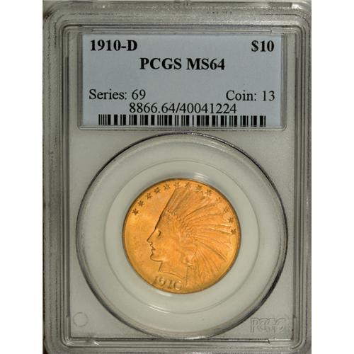 <B>1910-D $10 MS64 PCGS.</B></I> Practically every near-Gem or finer Saint-Gaudens eagle faces strong demand in today's market, where quality is often a driving factor. The yellow-orange fields of this piece have pleasing luster and the strike is solid, aside from the customary touch of softness in the centers. Highly appealing.<BR><BR><b>Shipping:</b> Coin/Currency (<a target="_blank" href="http://www.heritageauctions.com/common/shipping.php">view shipping information</a>)
