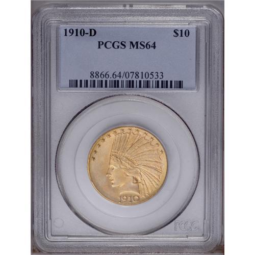 <B>1910-D<$10> MS64 PCGS.</B></I> Rich orange and olive shades endow this lustrous and suitably struck near-Gem. Despite a plentiful production, the 1910-D is tougher than expected in better Uncirculated grades, and is perhaps 10 times scarcer than the 1932.