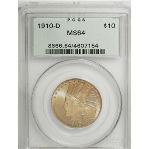 <B>1910-D $10 MS64 PCGS.</B></I> The swirling, slightly satiny luster of this near-Gem graces predominantly butter-yellow surfaces. An area of violet on the right feathers of the headdress adds distinction to this well-defined example.<BR><BR><B>Coin Engraver:</B> Augustus Saint-Gaudens<BR><BR><b>Shipping:</b> Coins & Currency (<a target="_blank" href="http://www.heritageauctions.com/common/shipping.php">view shipping information</a>)