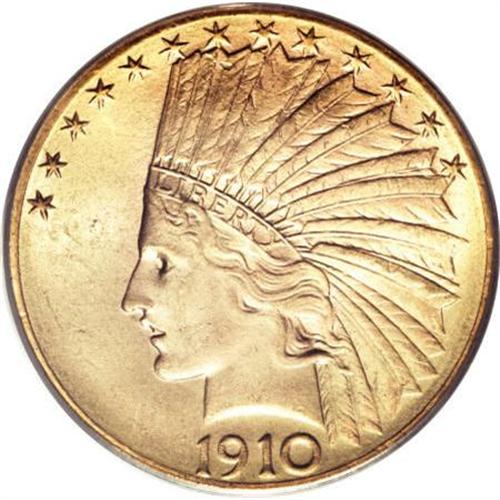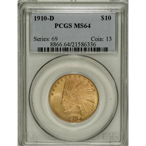 <B>1910-D $10 MS64 PCGS.</B></I> Solid detail overall, though the hair over Liberty's ear is a trifle soft. The yellow-gold and sun-gold surfaces show a touch of satin. Strong eye appeal for the grade assigned. Scarcer in better Mint State grades than its mintage suggests. PCGS has graded only 92 finer examples (3/08).<BR><BR><B>Coin Engraver:</B> Augustus Saint-Gaudens<BR><BR><b>Shipping:</b> Coins & Currency (<a target="_blank" href="http://www.heritageauctions.com/common/shipping.php">view shipping information</a>)