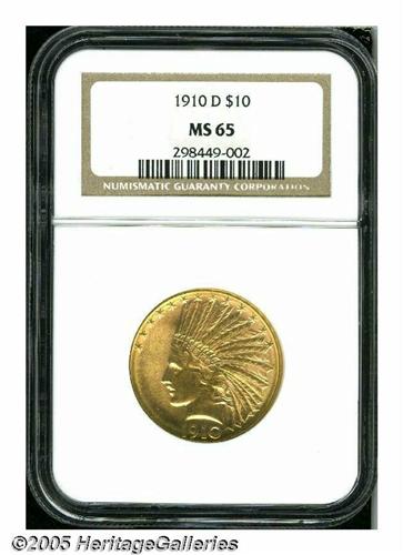 <B>1910-D<$10> MS65 NGC.</B></I> Brilliant and lustrous. Outstanding both technically and aesthetically. Here is an example superlatively suited for inclusion in either a high-quality date and mint collection or an extraordinary type set. We expect many generous bids when this beauty crosses the auction block.