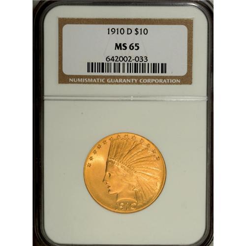 <B>1910-D $10 MS65 NGC.</B></I> Despite a mintage of more than 2.3 million pieces, Gem examples of this issue, like all issues of the Saint-Gaudens eagle series, are decidedly elusive. The design definition is superior, and the amber-gold fields have delightful luster. Hardly any marks are visible, and the prime focal areas are decidedly clean.<BR><BR><b>Shipping:</b> Coin/Currency (<a target="_blank" href="http://www.heritageauctions.com/common/shipping.php">view shipping information</a>)