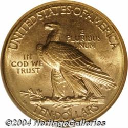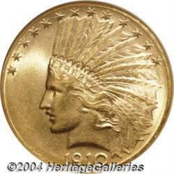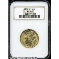 <B>1910-D<$10> MS65 NGC.</B></I> Third most common issue in the ten dollar Indian series, the 1910-D is not all that frequently encountered, though, in Gem condition. The surfaces on this piece are bright with shimmering mint luster and fully defined devices. <BR><BR><B>Important notice:</B> Heritage usually auctions material at the rate of 200-250 lots per hour. On some occasions eBay Live bid software or the Internet may not be able to keep up with the pace of the auction. We recommend placing a realistic absentee bid now as insurance to avoid disappointment. Occasionally the auctioneer may eliminate or reject an eBay Live bid, and the auctioneer may also reopen a lot after the close of the eBay live bidding (usually because we missed an audience bid), and may reject your bid even if it shows you as the winning bidder. By bidding via eBay Live, you agree that Heritage may award the lot to another bidder at its sole discretion under the circumstances described above or any other reasonable circumstances. Since eBay bids are not shown to us until we open the lot on the floor, we treat those bids just like floor bids. In most cases the floor responds before the eBay bid is presented to us, due to Internet lag time, so for consistency we have made it a policy that floor bids are always considered first over tie eBay live bids. Also please note that all Heritage lots purchased through eBay Live carry a 20% Buyer's Premium. Please make sure you read the Terms and Conditions before you bid. </span></font></tr></table></td></tr></table>